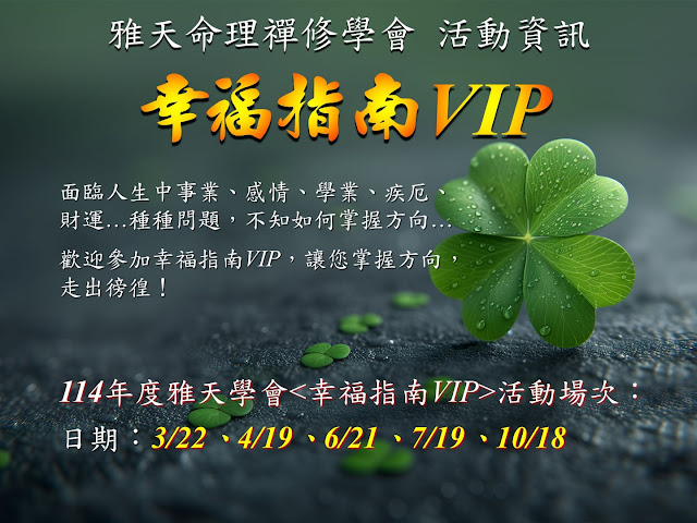 感謝老師幫忙!讓幸福指南VIP在地舉辦~歡迎大家一同來了解流月運勢。即日起開放各場次預約唷!!歡迎踴躍填寫報名。時間異動:原定1140719(週六下午),改為1140809(週六晚上)時間異動:原定1141018(週六下午),改為1141011(週六下午)新增場次:1141108(週六下午)